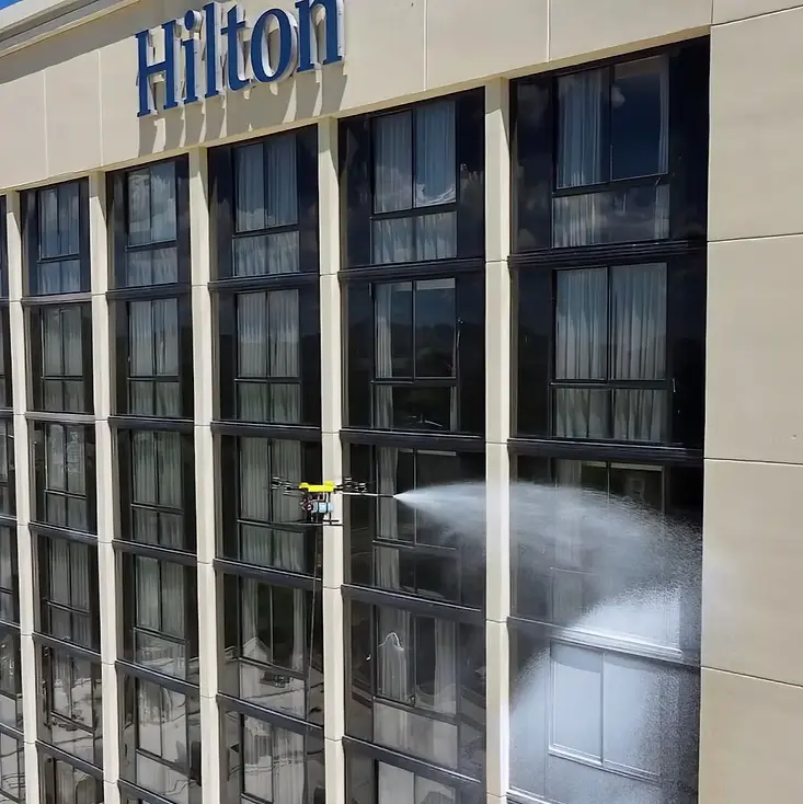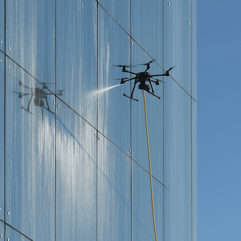 ניקוי זכוכיות בגובה באמצעות רחפנים חוסך טיפוס, שימוש בסנפלינג או פיגומים, ומאפשר תוצאה איכותית, מהירה ונקיה לכל חזית מודרנית.